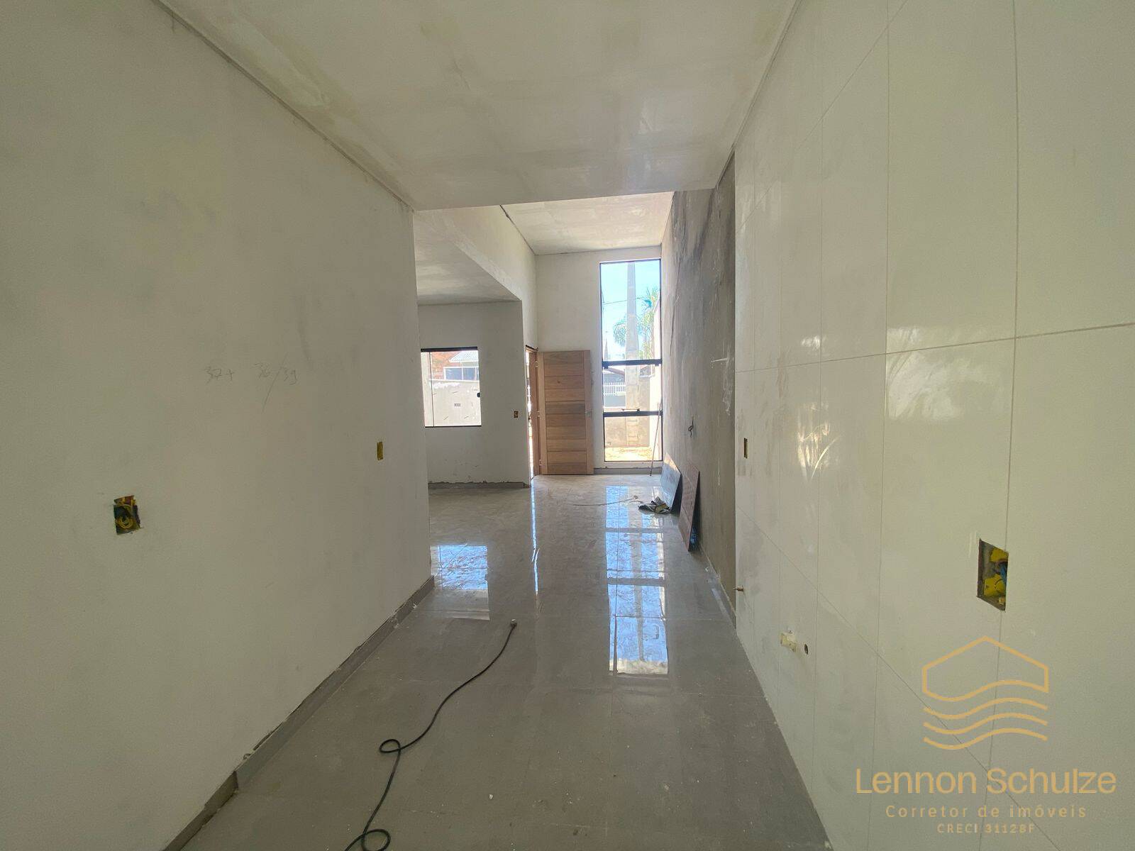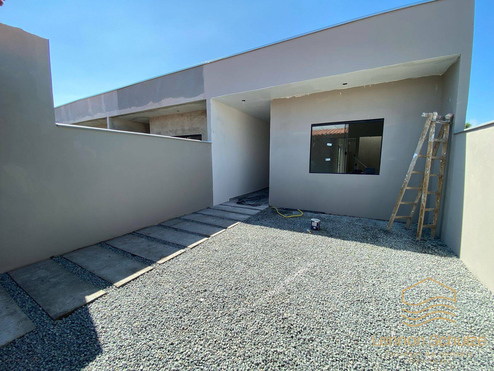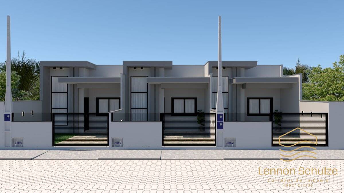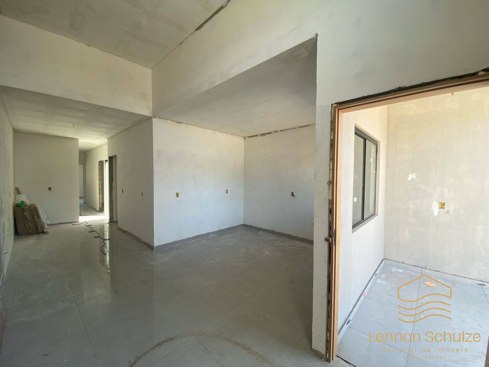 Código 0054- Casa Geminada unidade 01 (em fase de acabamento),terreno amplo com área total de 150,00m² (5,00x30,00), área construída de 81,36m², este geminado conta com excelentes 3 dormitórios, sendo que 1 é suíte, sala/copa/cozinha conjugada, banheiro social, lavanderia e vaga de garagem