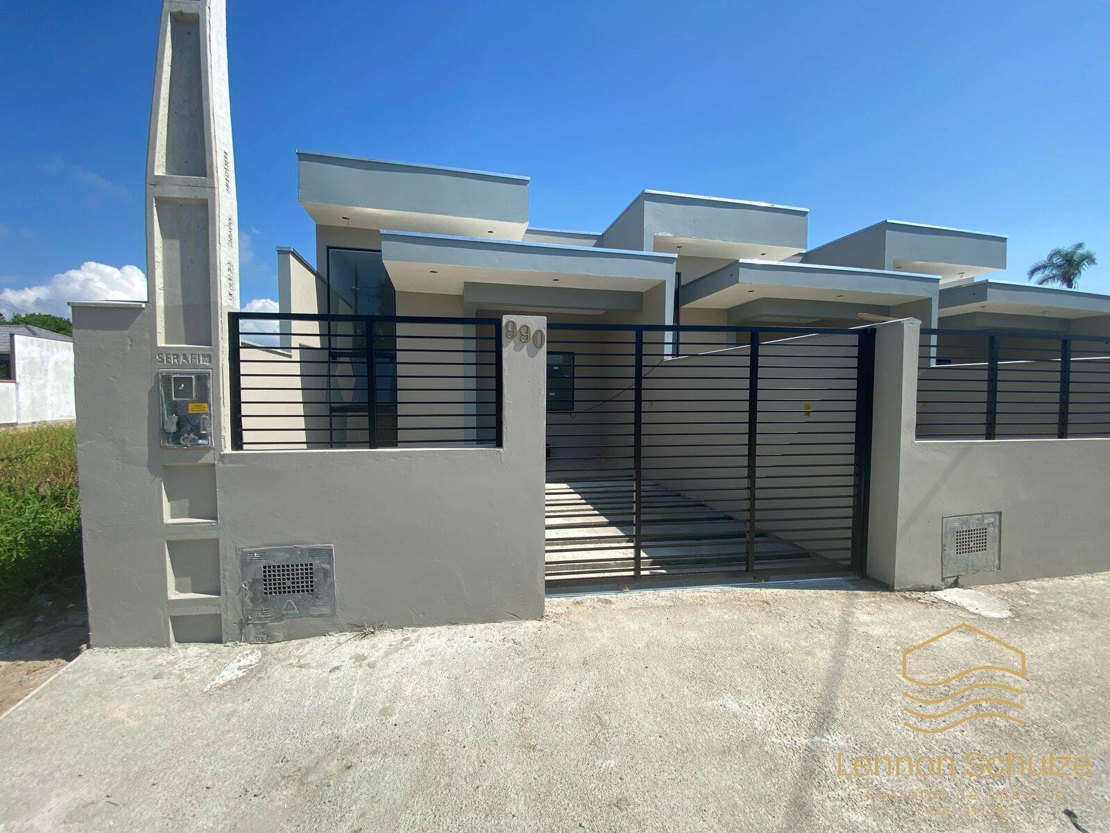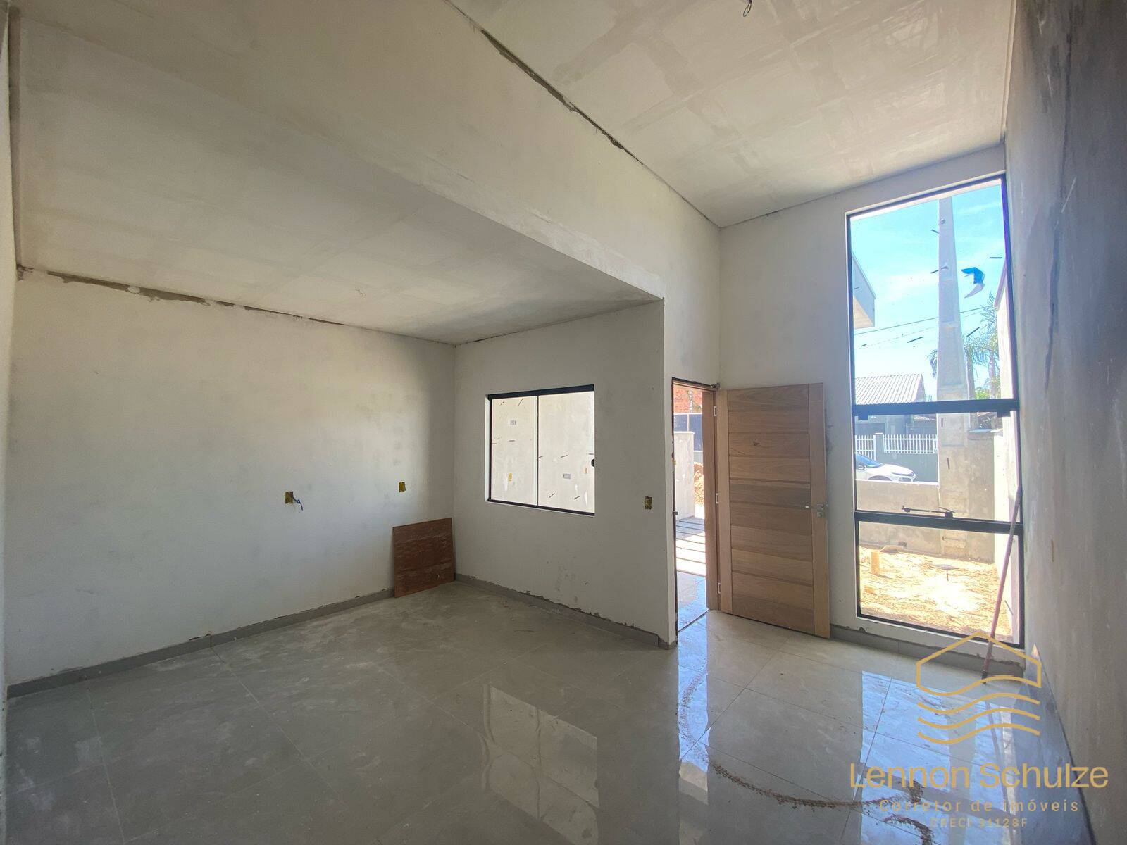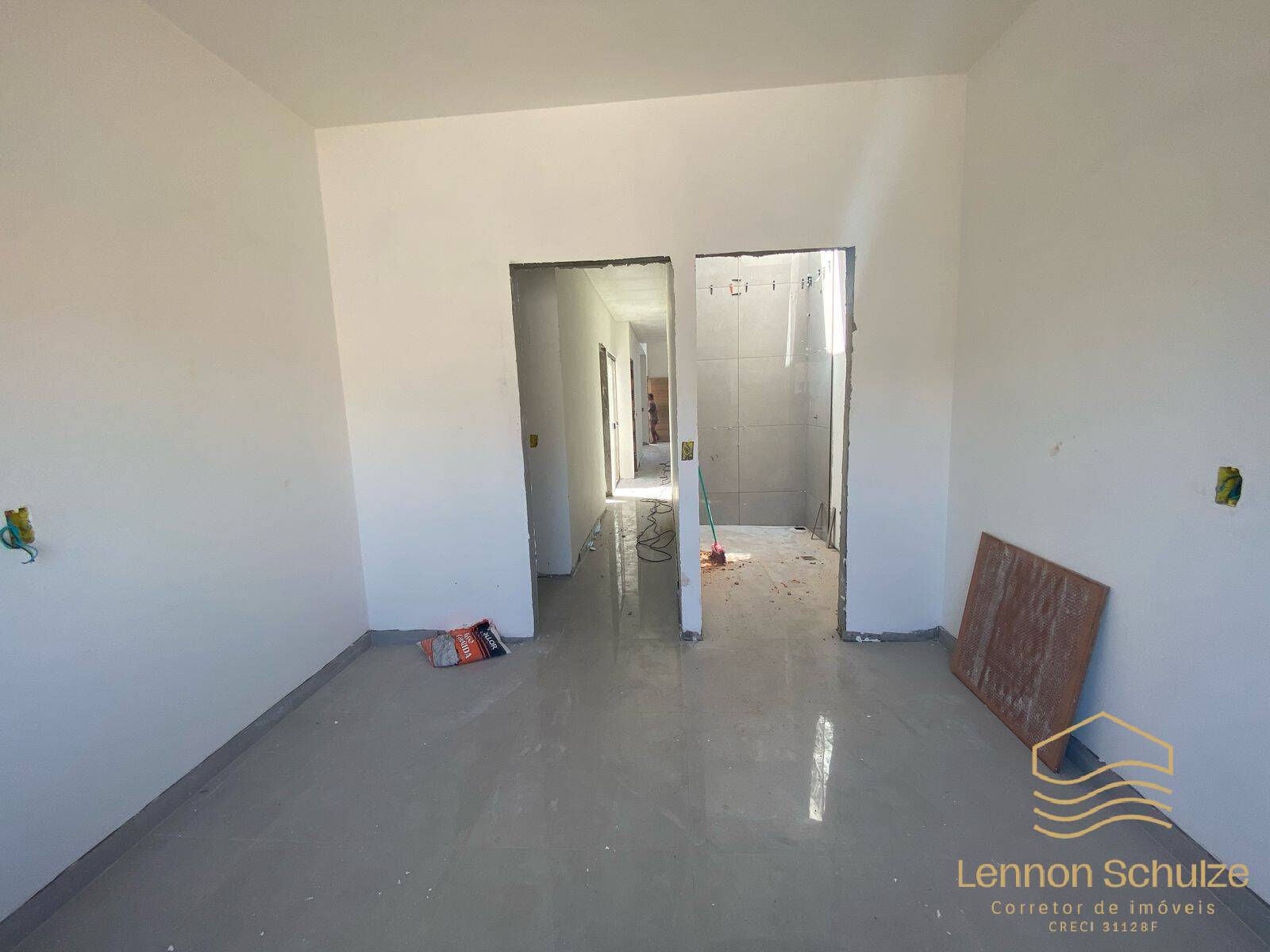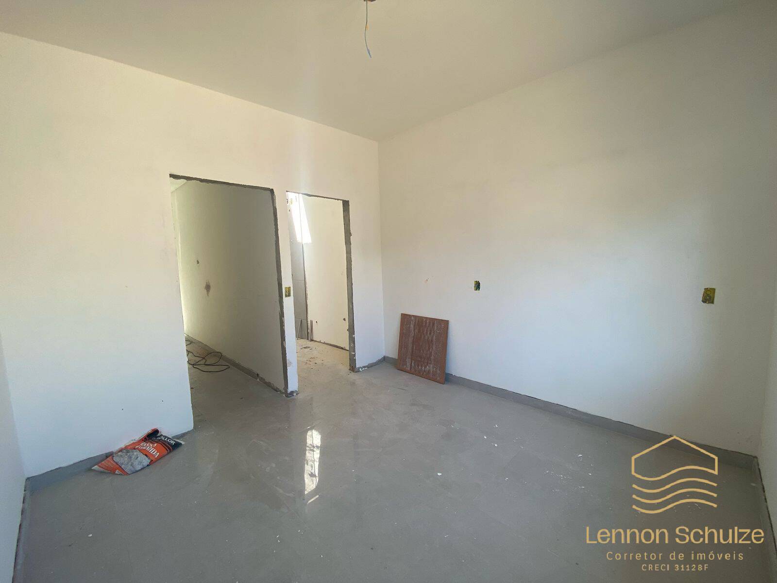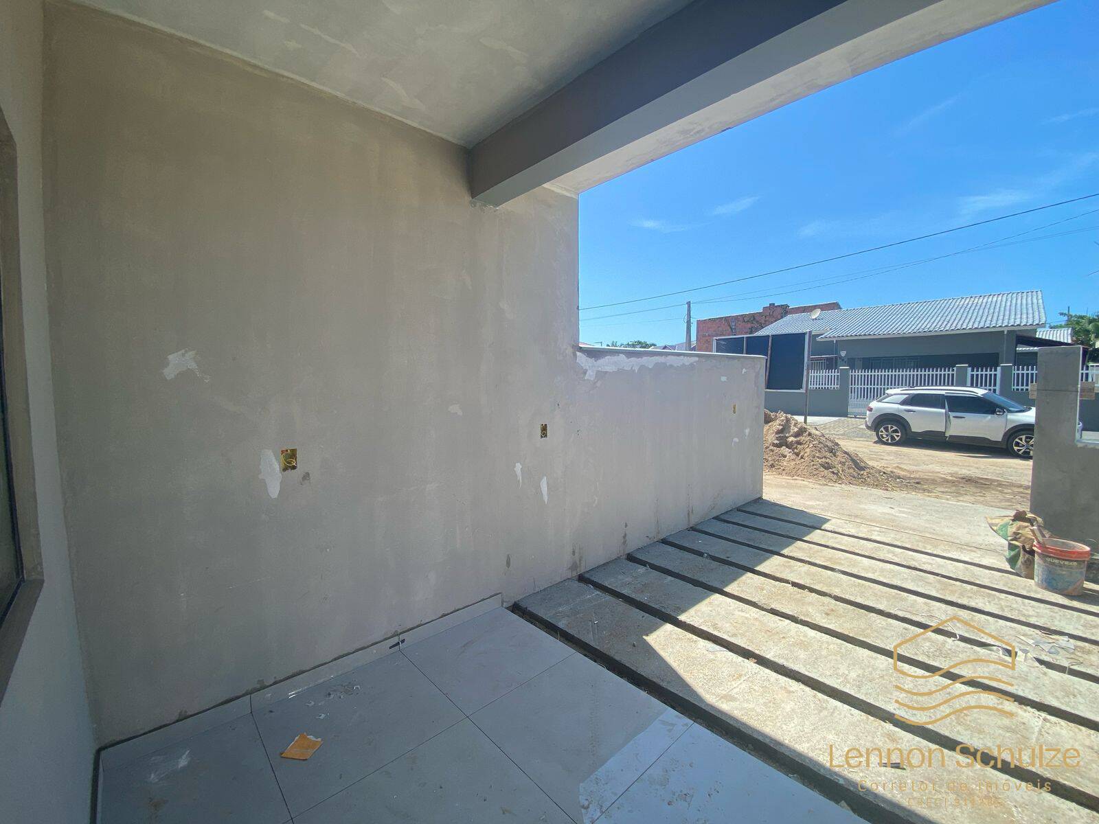Código 0054- Casa Geminada unidade 01 (em fase de acabamento),terreno amplo com área total de 150,00m² (5,00x30,00), área construída de 81,36m², este geminado conta com excelentes 3 dormitórios, sendo que 1 é suíte, sala/copa/cozinha conjugada, banheiro social, lavanderia e vaga de garagem